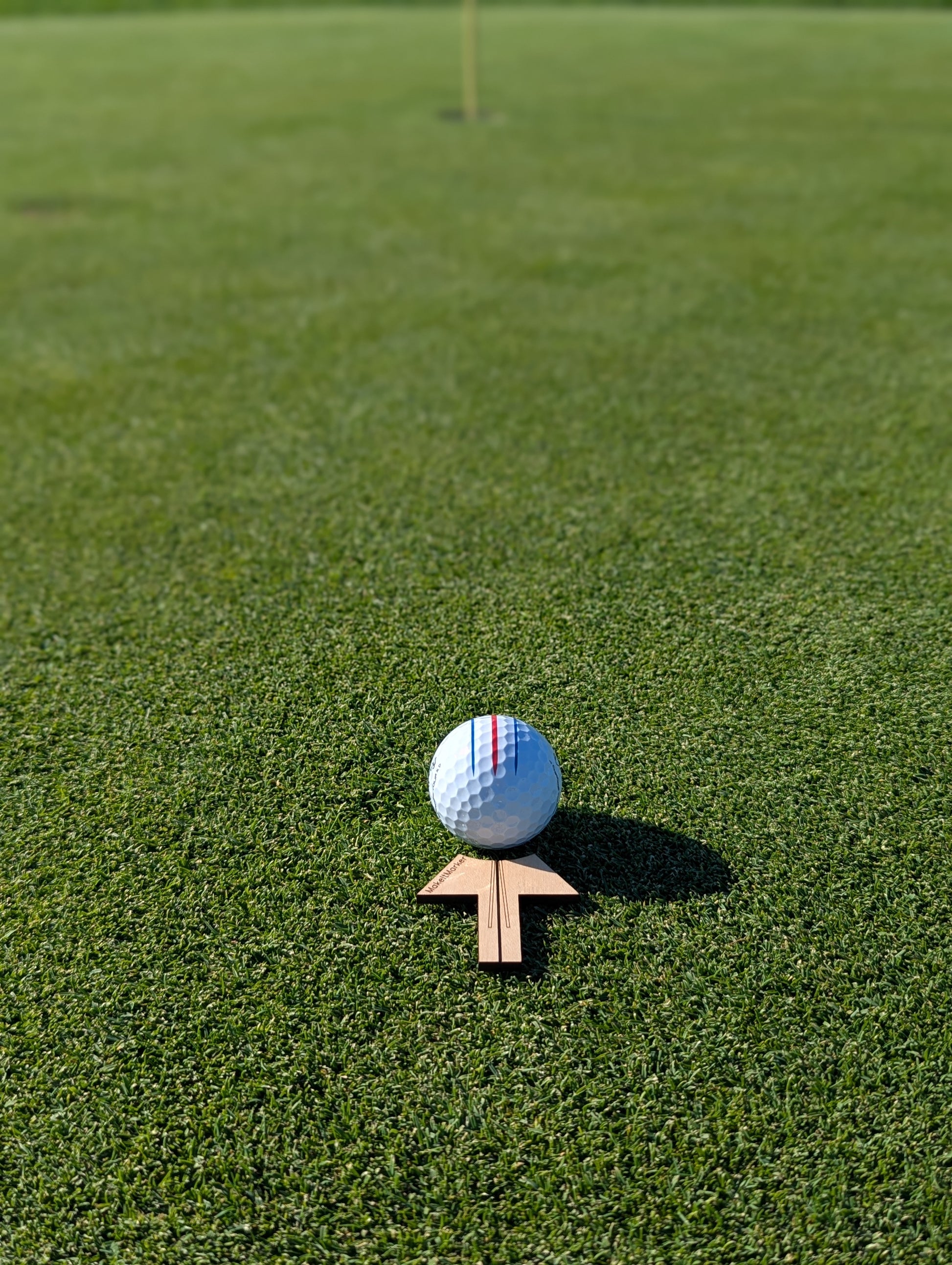 This tool allows for consistency by lining up the dark center line with the hole. A useful tool overtime, it provides a consistent indicator as you familiarize yourself with how much break to play on putts. If you miss a putt you now know where you were aimed so on the next similar breaking putt play slightly more or less break to make the putt!